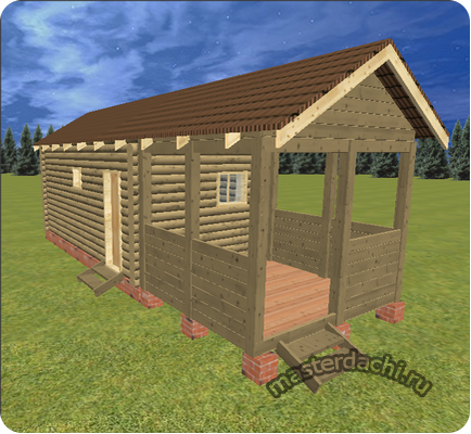 Продуманный проект бани из бревна состоит из двух частей: собственно сруба, выстраиваемого на прочном ленточном фундаменте, и легкой беседки, для которой подходит столбчатый фундамент.