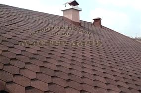 Укладку рядовой мягкой черепицы начинают от центра карнизного свеса, двигаясь в стороны торцов крыши. Каждый элемент необходимо приклеивать и прибивать четырьмя гвоздями, а если уклон крыши более 45º, то гвоздей нужно не менее 6-ти.