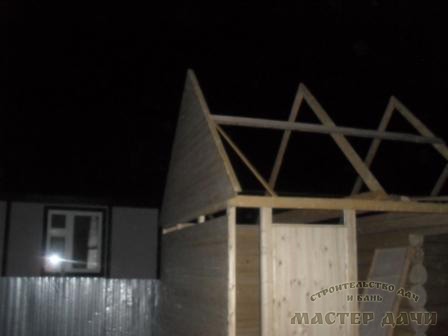 Очень важным элементом в бане является крыша, нужно правильно выбрать подходящий угол ската, для того чтобы ваша баня выглядела лучше чем у соседа. Конструкция крыши состоит из стропил и подстропильных брусков размером 50х100 - 50х150 мм из хвойных пород пиломатериала. Обрешеткой служит обрезная доска 25х150 мм. Фронтоны и карнизы оббиваются деревянной евро вагонкой класса "А, В" Кровля согласовывается с вами заказчиками, профнастил либо метало черепица. Во всех наших проектах используется профнастил, оцинкованный либо крашенный.