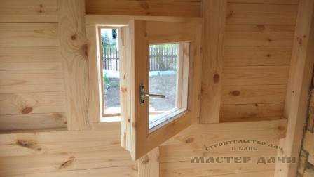 Окна изготовлены из массива дерева, с двойным остеклением и форточкой для проветривания бани. Размеры зависят от площади застройки деревянной бани, для небольших 500х500 мм, а для больших строений бань окна используются от 600х800 мм до 800х1000 мм. Расстановка окон, обговариваются с заказчиком в начале совершения строительства бани. Их установка обязательна так как баню необходимо проветривать и просушивать для того чтобы не образовывался грибок который может привести к большим неприятностям.