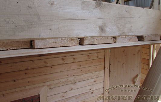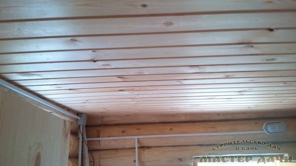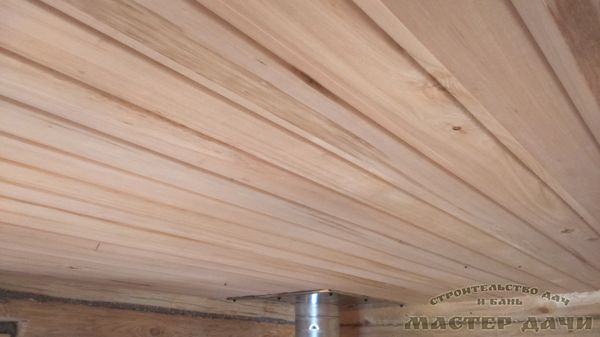 Потолок настилается в два слоя: первый слой черновой из обрезной доски 25 на 150 мм, второй чистовой из липовой евро вагонка толщиной 15 мм и шириной 90 мм, подшив производится снизу, образуя ровную поверхность. Утепляется потолок опилками либо керамзитом (по желанию заказчика) с предварительным настилом гидроизоляции. По вашему желанию, есть возможность строительство потолка из более толстой обрезной доски, осины, которая не содержит смолы.