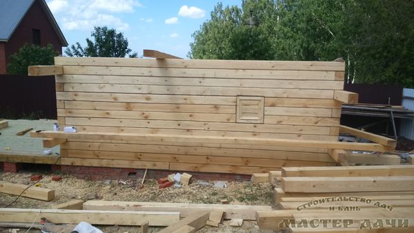 Для коробки стен используется сруб из бруса естественной влажности 150х150 мм либо рубленое бревно диаметром 22-32 см, в зависимости какая баня будет строится. Весь сруб до возведения строгается электро рубанками. Рубка сруба из бревна производится ручным методом в лапу или чашу, из лиственных (осина, липа) или хвойных (сосна, елка) пород дерева. Брусовый сруб возводится используя деревянные нагеля (шканты) для того чтобы после установки сруба брусья не увело и не загнуло. Межвенцовым утеплителем для сруба из бруса и бревна служит льноватин. Все материалы изготавливаются из зимнего леса, для увеличения их качества и долговечности.